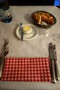 Die Tische sind allesamt sehr gepflegt und geordnet eingedeckt. Hier sitzt jedes Teil millimetergenau an seiner Stelle. Die Teller sind gebrandet, die Butter in kleinen Schüsserln, die rot-weißen Servietten aus Stoff und das Baguette frisch in Stücke geschnitten. Welch Duft.