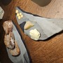 Vierter Gang, Jakobsmuscheln & Johannisbrot: Zwei Jakobsmuscheln in brauner Butter, mit ein wenig Limette, darauf je ein Parmesan-Chip mit Staub von Johannisbrot, dazu Mole von Johannisbrot und Limettengelee. Johannisbrot, die grobe Schote vom Johannisbrotbaum, gibt einen leichten Lakritzgeschmack, aber deutlich dezenter. Sehr schöner Gang, sehr kluger Gang.