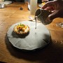 Sechster Gang, Dessert, Walnuss & Quitten: Eine vorzügliche Tartelette mit Quitten, Birne, Feigen, Limettenkaviar – dazu eine Walnusssauce auf den Stein gegossen. Cool, gut, optisch eine Freude.